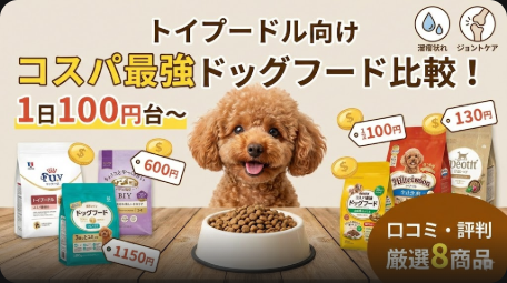 トイプードル向けコスパ優秀ドッグフード8商品の口コミ評判を徹底調査。1日100円台から始められるフードも紹介。涙やけ・毛並み・関節ケアに効果的な商品を予算別に比較します。 -