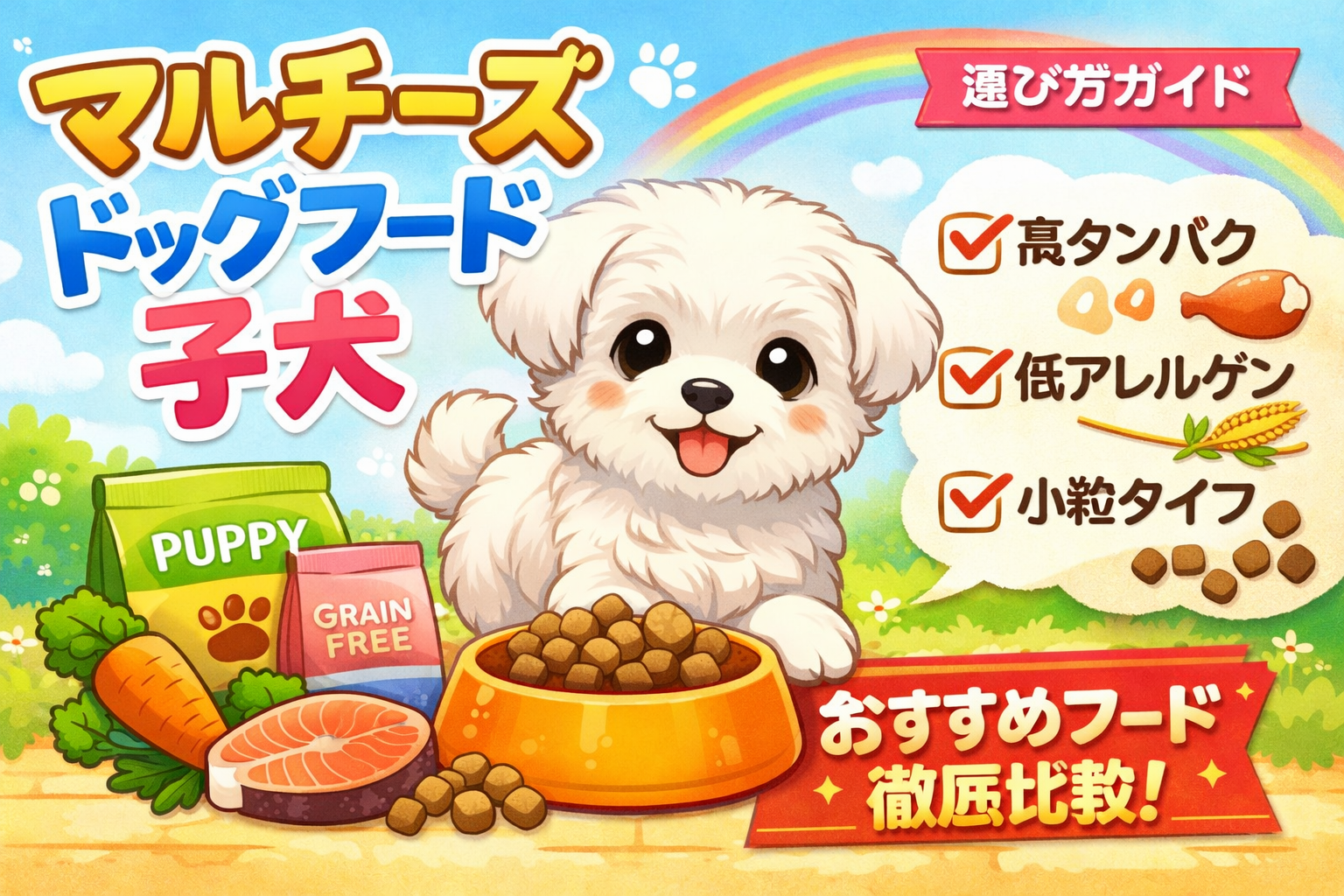 マルチーズの子犬を迎えたばかりの飼い主さんにとって、ドッグフード選びは最初にして最大の悩みです。結論から言うと、マルチーズの子犬には「動物性タンパク質が豊富」「グレインフリーまたは低アレルゲン」「小粒で食べやすい」の3条件を満たしたフードが最適です。この記事では、パピー期特有の栄養ニーズや涙やけ対策まで含めて、おすすめ5商品を徹底比較します。