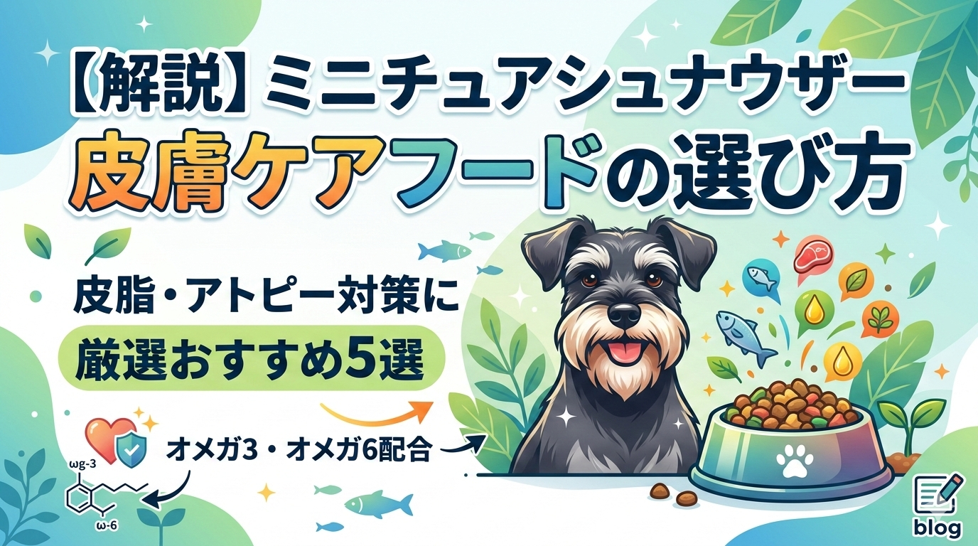 ミニチュアシュナウザーは皮脂分泌が多く、膿皮症やアトピー性皮膚炎などの皮膚トラブルを起こしやすい犬種です。皮膚の健康を内側から支えるには、オメガ3・オメガ6脂肪酸が豊富で、アレルゲンになりにくい良質なタンパク質を使った低刺激のドッグフードを選ぶことが重要です。本記事では、皮膚ケアに特化したフードの選び方とおすすめ5選を詳しく解説します。