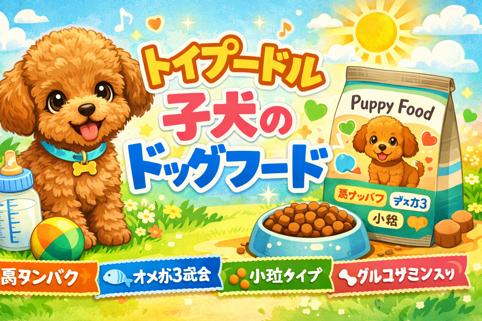 トイプードルの子犬を迎えたばかりの飼い主さんにとって、毎日の食事選びは最も大きな悩みのひとつです。結論からお伝えすると、トイプードルの子犬には「高タンパク・小粒・オメガ3脂肪酸配合・グルコサミン入り」の総合栄養食を選ぶのが正解です。本記事では、トイプードルのパピー期に特化したドッグフードの選び方から、月齢別の餌の量・回数・ふやかし方、成犬用への切り替え時期まで、子犬の飼い主さんが知りたい情報をすべて網羅しました。