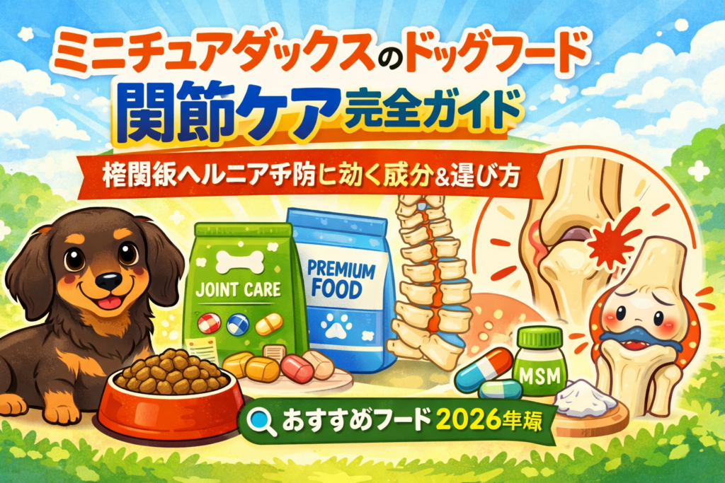 ミニチュアダックスのドッグフード関節ケア完全ガイド|椎間板ヘルニア予防に効く成分・選び方・おすすめフード【2026年最新】 ミニチュアダックスフンドの関節・椎間板ヘルニア対策は、毎日のドッグフード選びから始まります。グルコサミン・コンドロイチ...